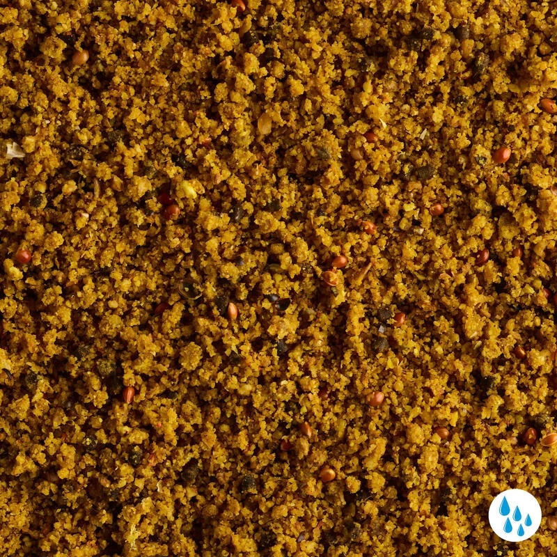 Chapelure, graine de millet roux, pellet (blé, farine de poisson, tourteau de soja, huile de colza, farine de sang, huile de poisson) (7%), maïs, chenevis, noix tigrée, ail (1%), arÎme ail (1%)