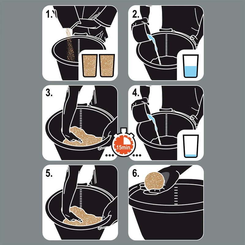 On commence tout d’abord par verser les 3/4 du volume d’eau nĂ©cessaire en mĂ©langeant Ă©nergĂ©tiquement avec la main dans un seau rond pour permettre aux particules de l’amorce de se gorger d’eau.