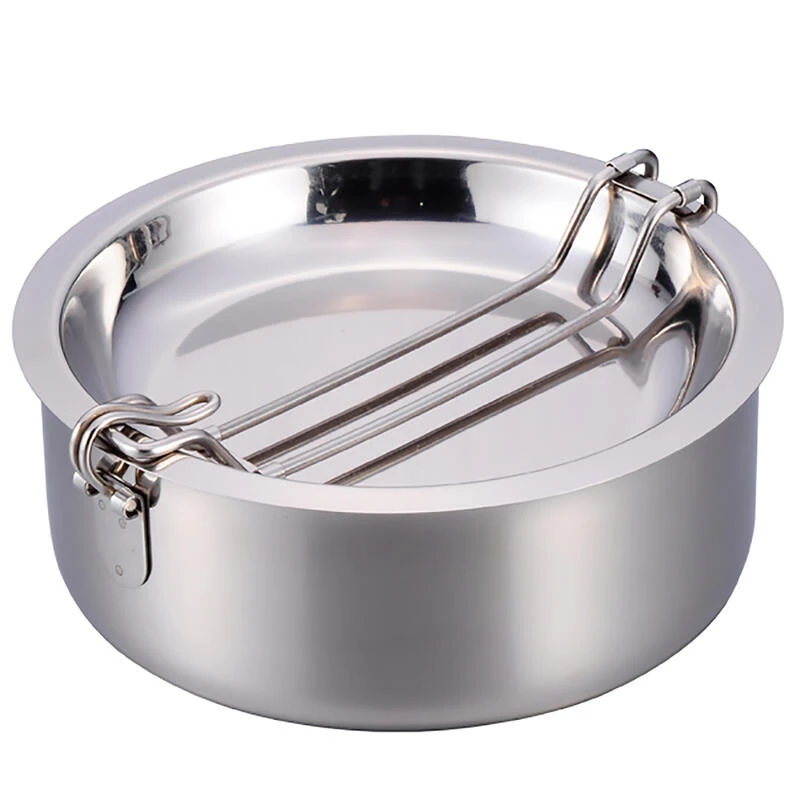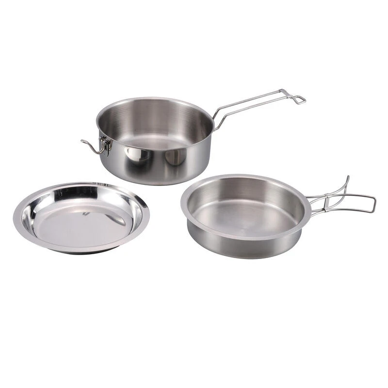 Ensemble de casseroles en acier inoxydable pratique et robuste, comprenant une casserole, une poĂȘle et une assiette profonde. La casserole et la poĂȘle ont des poignĂ©es pliables.
