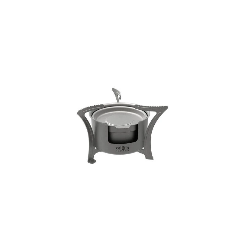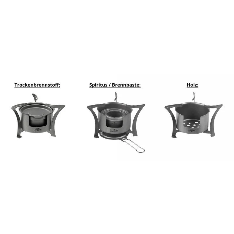 Cette ultra-lĂ©gĂšre cuisiniĂšre Titan peut ĂȘtre utilisĂ©e avec de l’alcool, de la pĂąte combustible et des combustibles solides comme le combustible sec ou le bois (plus les cubes Esbit).