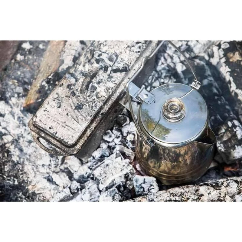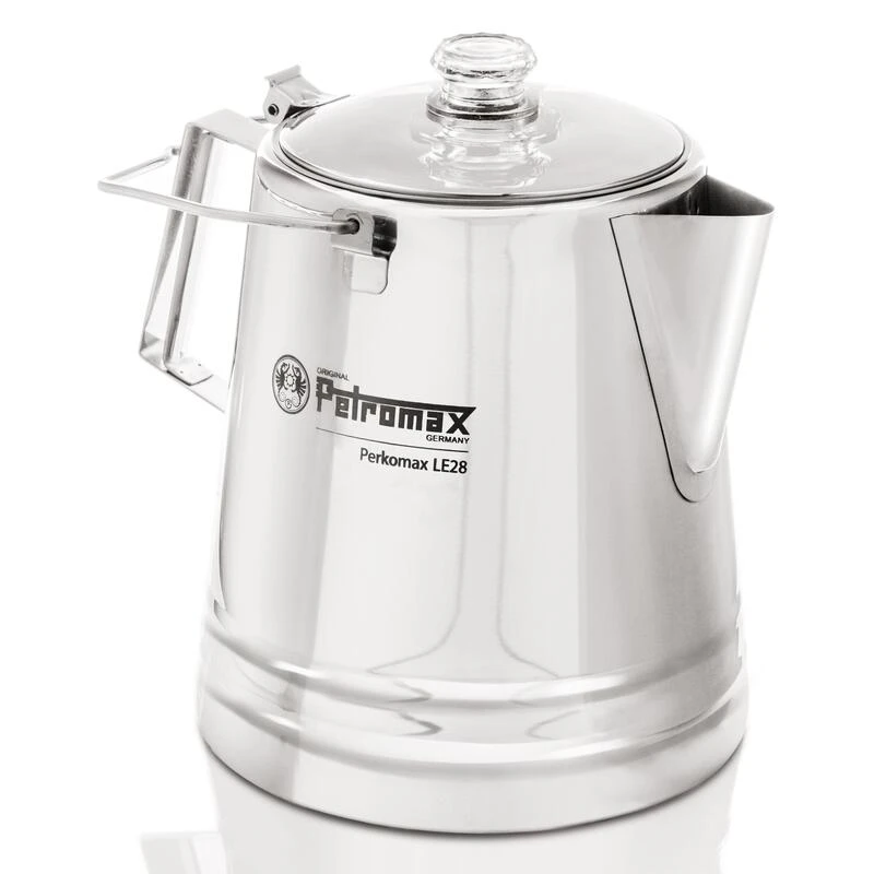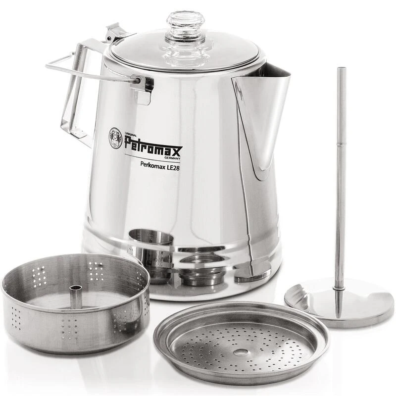 Percolateur en acier inoxydable durable avec une molette en verre. PrĂ©parez le meilleur cafĂ© sur votre feu de camp. Jusqu’Ă 28 tasses de cafĂ© !